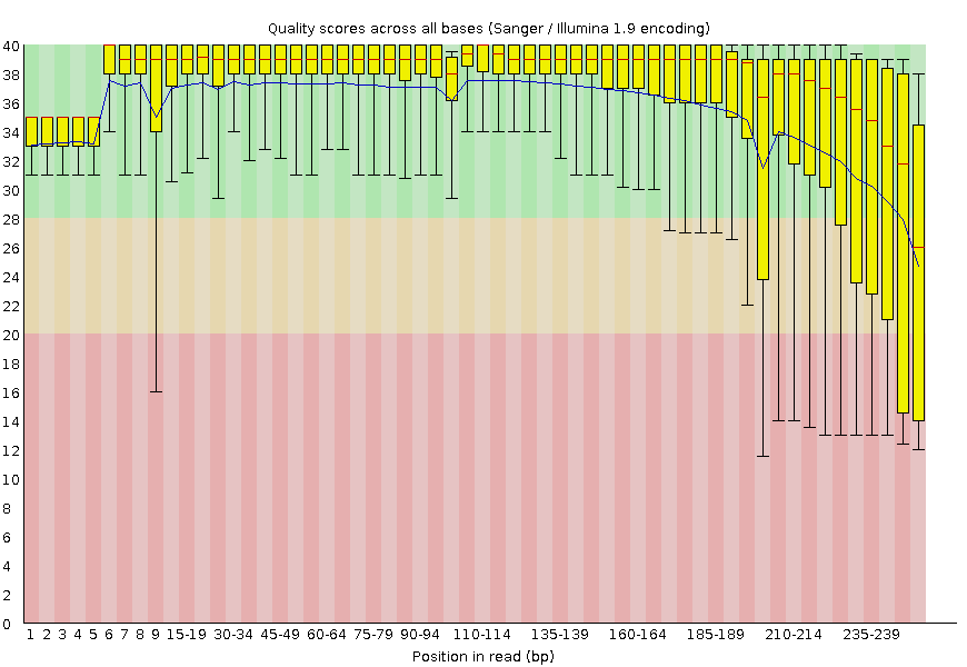 The plot's background is color-coded to facilitate quick assessment of quality levels: green indicates high-quality scores above 28, orange signifies reasonable quality scores between 20 and 28, and red denotes poor quality scores below 20. In this plot, the quality scores are consistently high and within the green zone from positions 1 to 150 bp, indicating strong confidence in base calling in this region. Beyond position 150 bp, there is a noticeable decline in quality. From positions 150 to 200 bp, the scores decrease but generally remain within the green zone. However, between positions 200 and 239 bp, there is a sharp decline, with quality scores dropping into the orange and even red zones. Additionally, the spread of the box plots widens towards the end of the reads, reflecting increased variability and uncertainty in the base calls in these later positions.