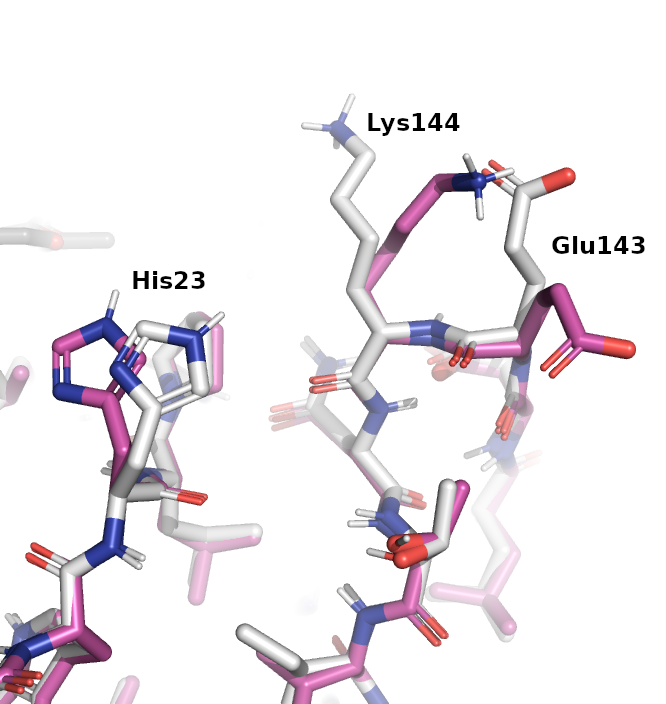 Conformations of His23, Glu143, and Lys144 of DHFR are shown below for 3FRD and 6PR6 with carbon atoms shown in pink and white, respectively.